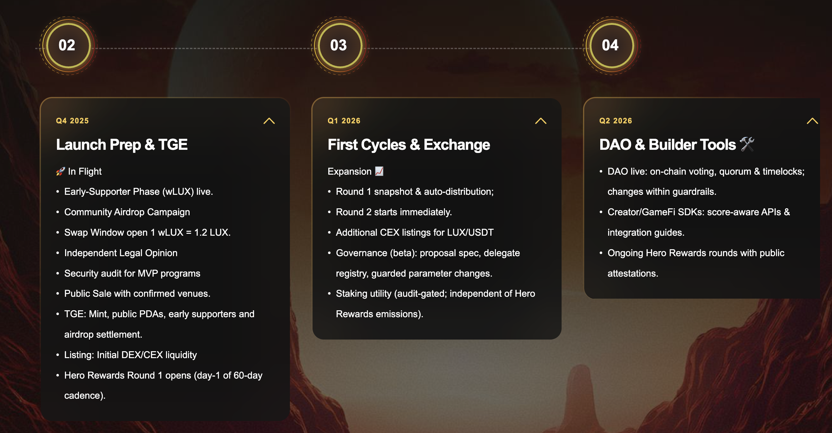 Future Revenue Streams – GameFi Tools (Q2 2026+) Starting in Q2 2026, Luxxcoin will introduce additional GameFi tools and products designed to integrate with the season-based competition system. These new modules will expand the ecosystem and create diversified long-term revenue channels beyond the Hero Rewards model.